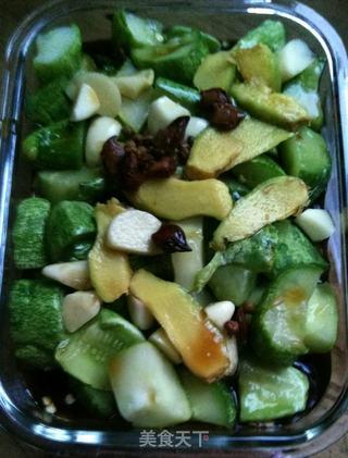 2. 处理脆瓜:将脆瓜切成条状,用盐腌制然后用水冲洗干净,沥干水分。